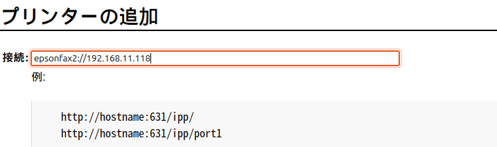 - epsonfax2://に続いて、プリンタのIPアドレスを入力します。