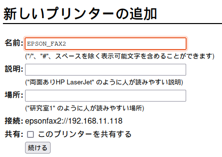 - CUPSへの登録名を入力します。以下の例ではEPSON_FAX2としています。