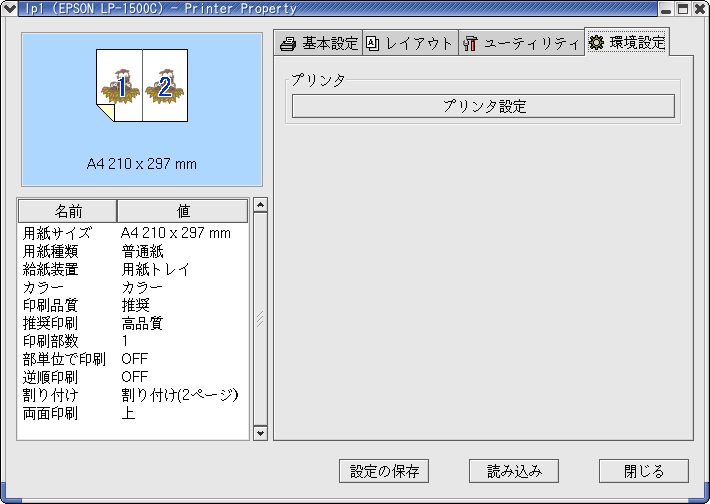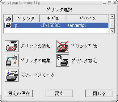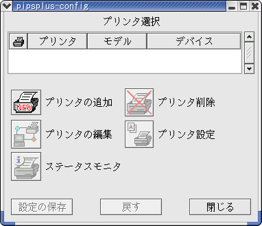 プリンタの環境設定をする場合は、pipsplus-configの「環境設定」から