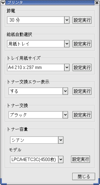 プリンタの節電モードの設定や、トナー交換時のトナーカートリッジの位置調整の操作など